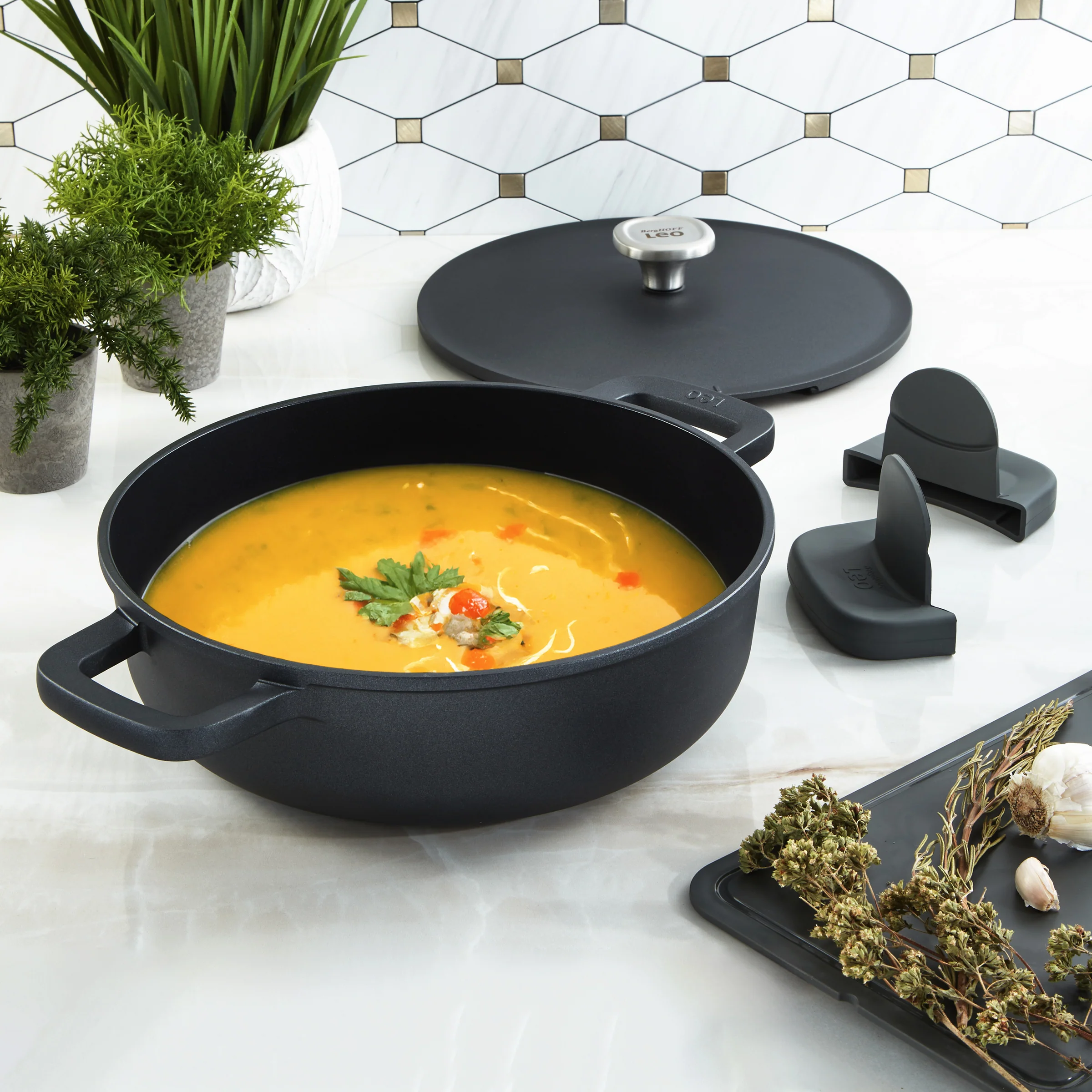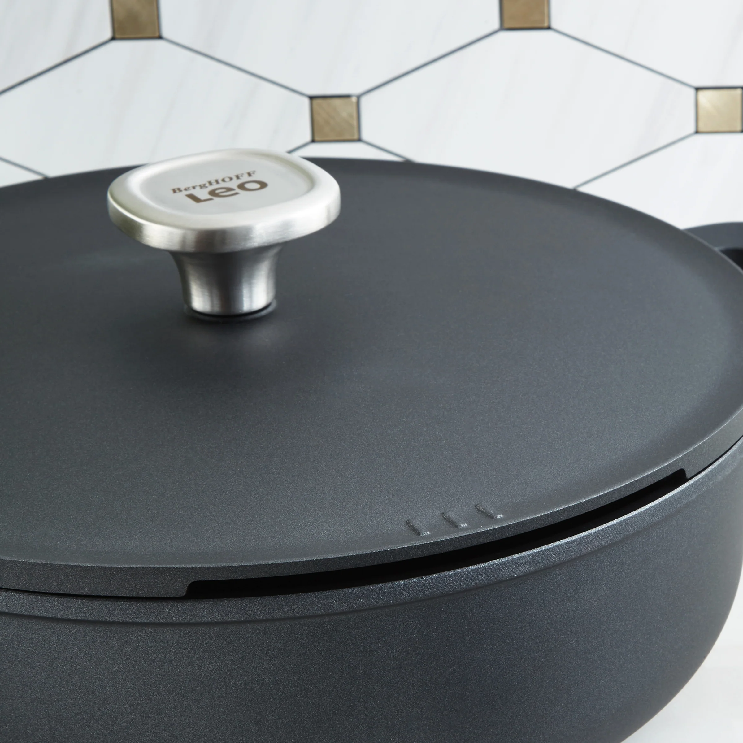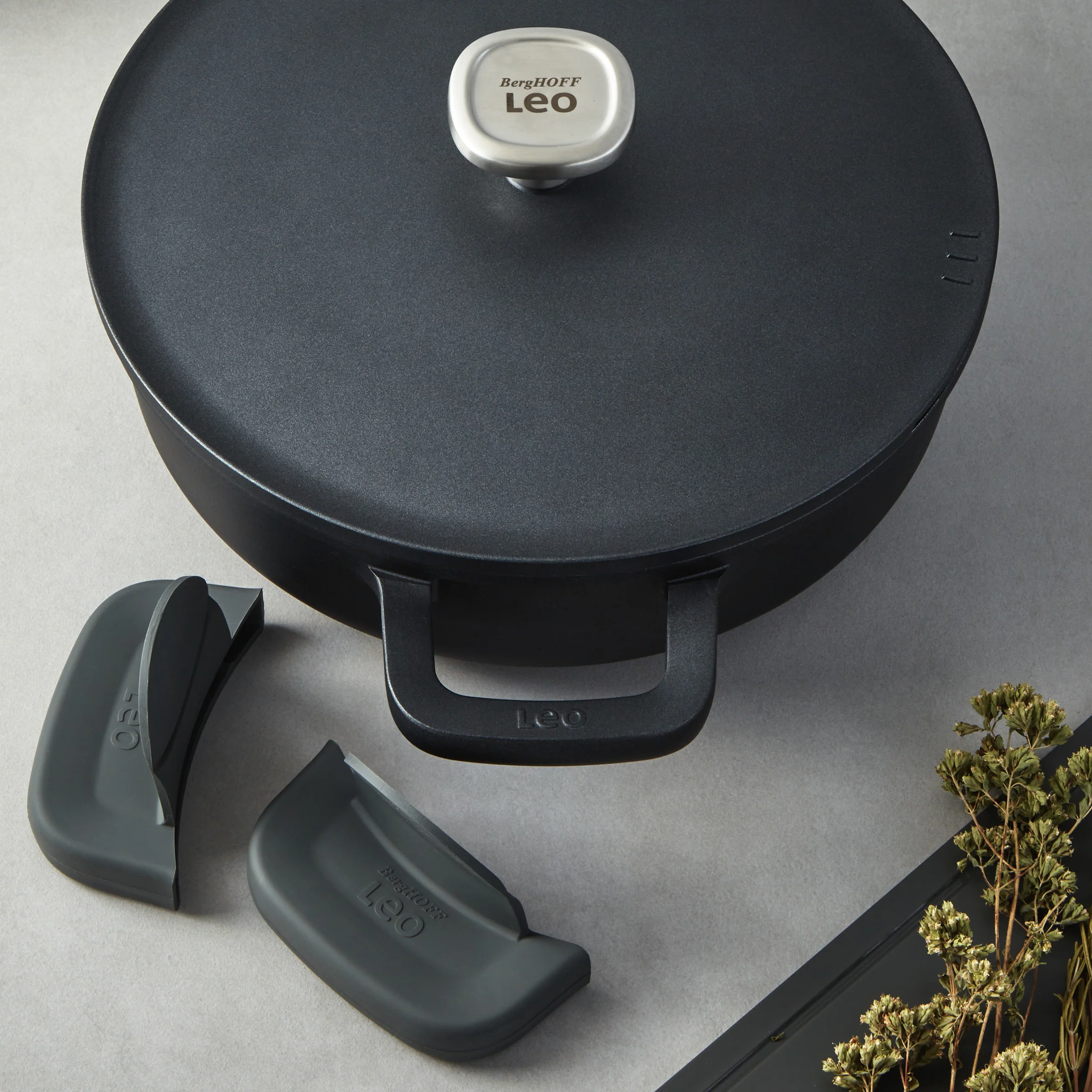 Frying, roasting or baking larger portions of meats and fish is a piece of cake with this 2-handle sauté pan. The CeraGreen coating, which is healthy and ceramic, allows you to cook with little to no oil, releases food easy and is easy to clean. It’s recycled aluminium body and full disk base ensure a fast and even heat distribution for energy-efficient cooking on all cooktops including induction. The lid includes self-basting condensation bumps and an integrated straining function. On top of that you can safely take the pot out of the oven or strain boiling water thanks to the removable silicone sleeves.