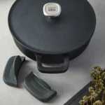 | Unique features | Self-basting condensation bumps on the cover’s interior Made with recycled aluminium Healthy CeraGreen ceramic non-stick coating (PFAS-free) Full disk base that conducts heat fast and evenly for energy-efficient cooking Cover with integrated straining function Included removable silicone sleeves ensure you to safely take pots out of the oven and safe straining of boiling water Ovenproof up to 230°C / 446°F (without silicone sleeves) |