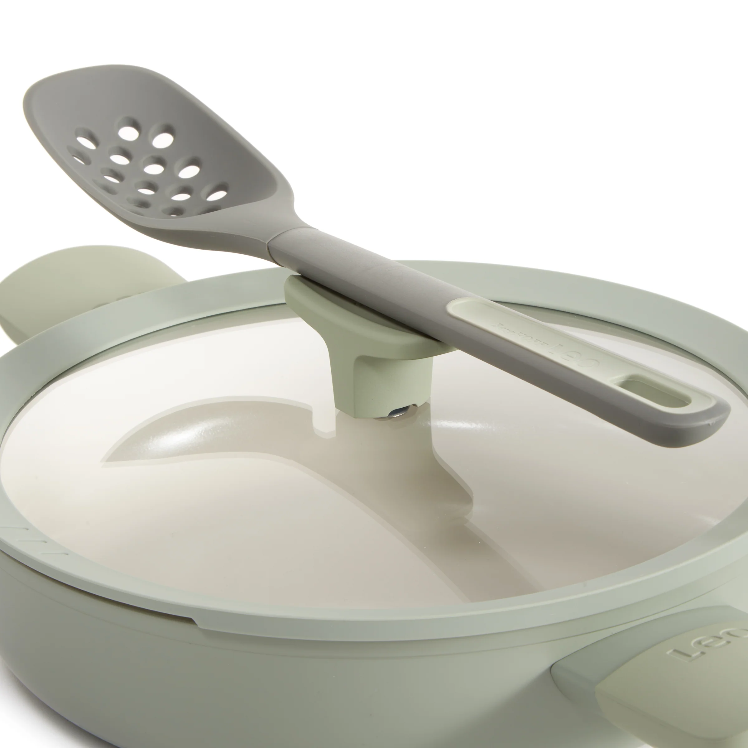 Anyone in the mood for a tasty stir-fry, a flavourful paella or a savoury risotto? With this covered stir fry pan, you’ll create the most delicious treats in no time! The 100% recycled aluminium body guarantees a fast and even, energy-efficient, heat distribution on any kind of stovetop, including induction. The stir fry pan is covered with a high-quality, sustainable and healthy ceramic non-stick coating that not only allows you to cook with little to no oil but also makes the pan a breeze to clean. Add to this the stay-cool handles and the clear glass lid that comes with a spoon rest and an integrated straining function, and you’ve got a stir fry pan that excels in user-friendliness.