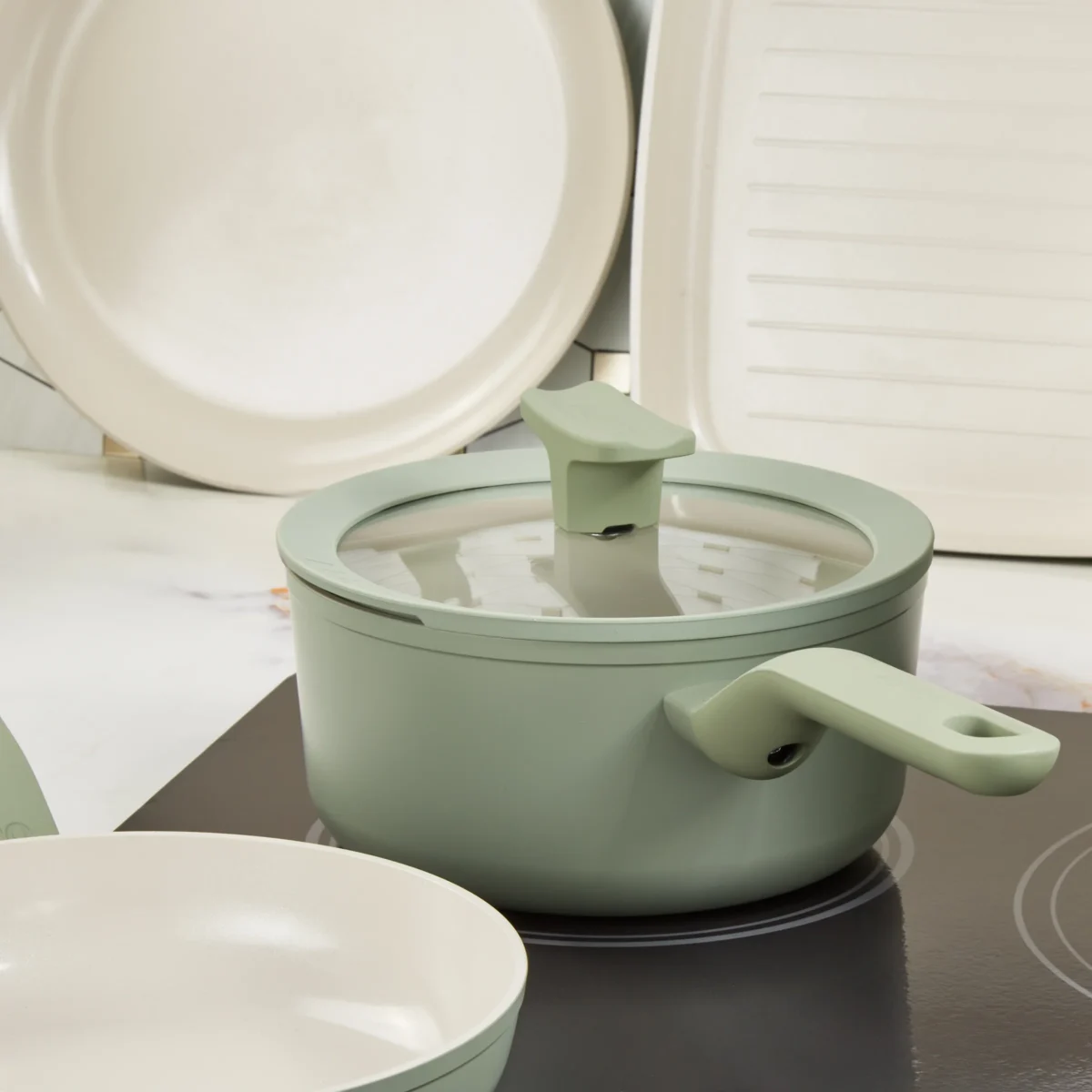 | Unique features | Clear glass cover with integrated air duct and straining function Special knob with spoon rest function Made with recycled aluminium Healthy CeraGreen ceramic non-stick coating (PFAS-free) Full disk base that conducts heat fast and evenly for energy-efficient cooking Ovenproof up to 180°C / 356°F |