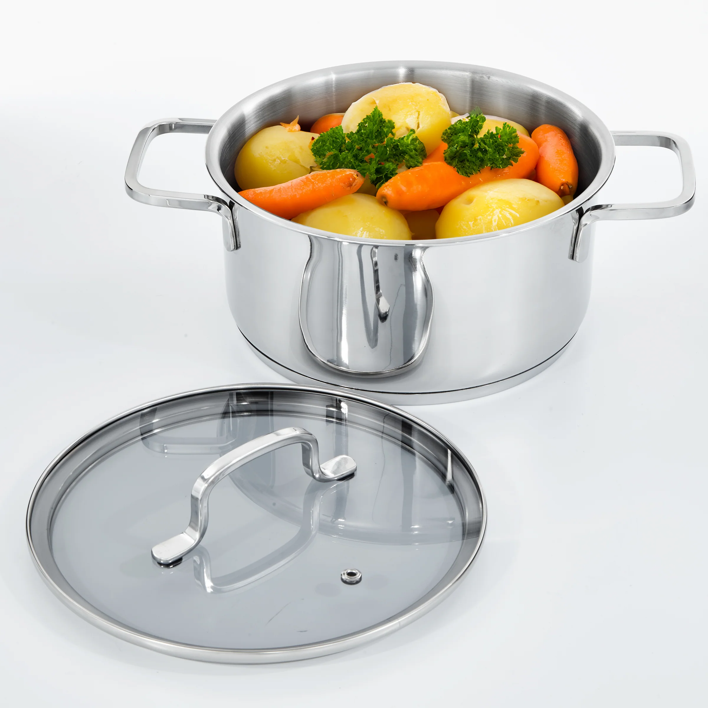 Whether you’re making a batch of soup to last a few days, a homemade broth or a large portion of pasta, this stainless steel stew pot with lid is a breeze to prepare. Made from high quality recycled stainless steel with a stylish satin finish, the pot has a capsule base that ensures quick and even heat distribution on all types of cookers, including induction. When you’re ready to cook, simply use the handy capacity markings to measure out the right quantities and place the clear glass lid with integrated steam vent on top to speed up the heating process and keep an eye on your food as it cooks.